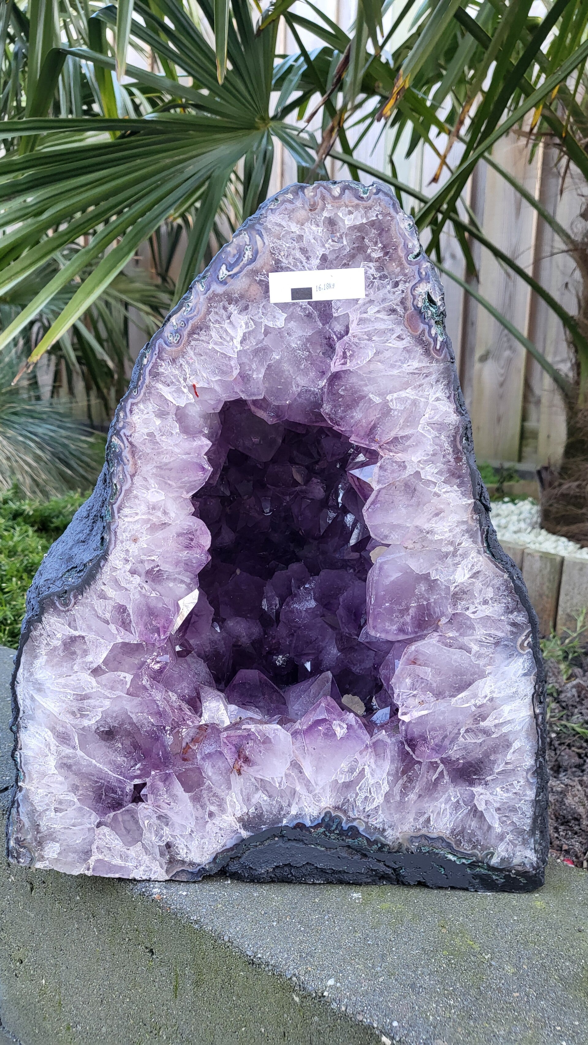 Een prachtige amethist geode afkomstig uit Brazilië. Deze geode is gevuld met dikke, dieppaarse amethist kristallen. Een uniek en decoratief stuk voor elke verzamelaar of liefhebber van mineralen. Afmetingen: 33 cm hoog, 26 cm breed. Gewicht: 16,18 kg.