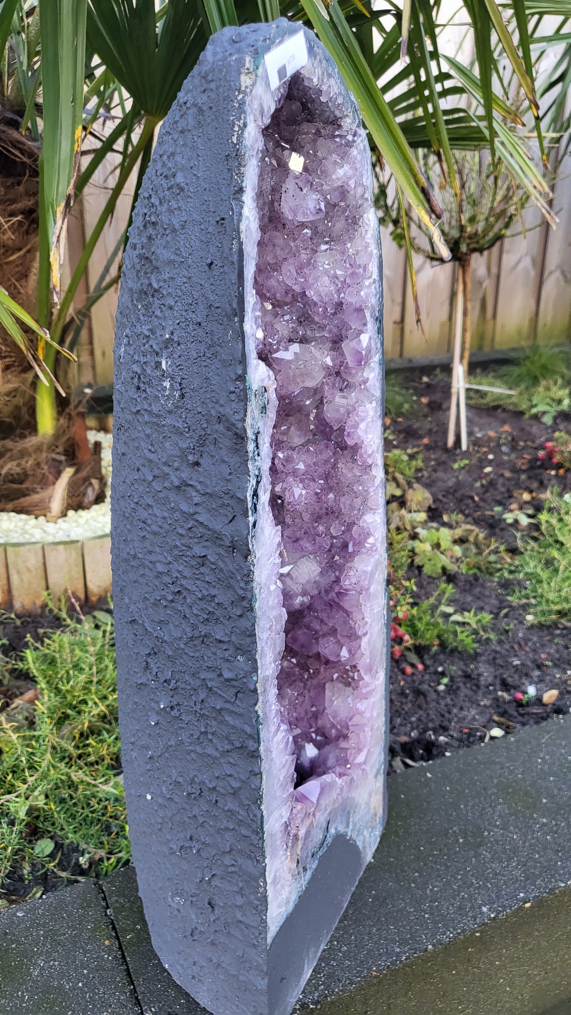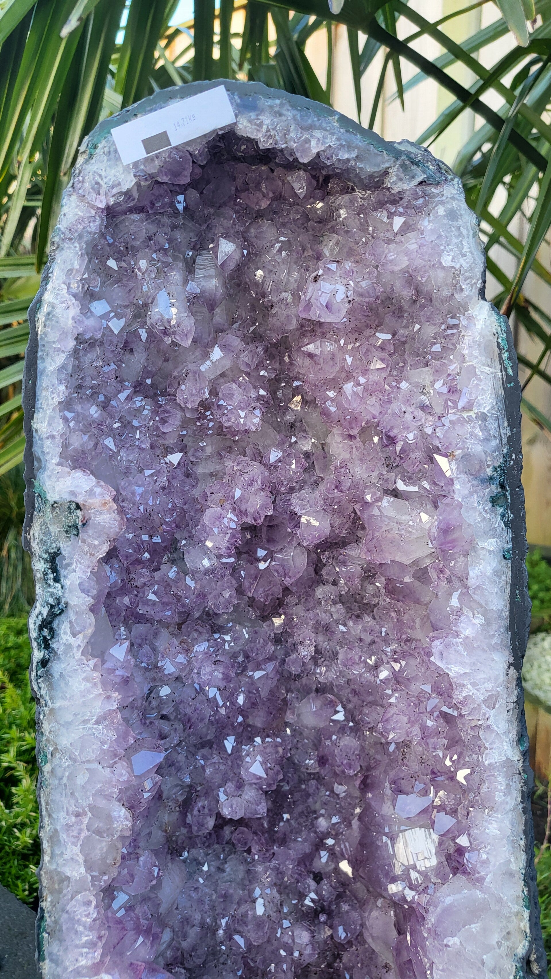 een prachtige amethist geode uit Brazilië. Deze geode weegt 14,71 kg, is 52 cm hoog en 19 cm breed.De kwaliteit is erg mooi