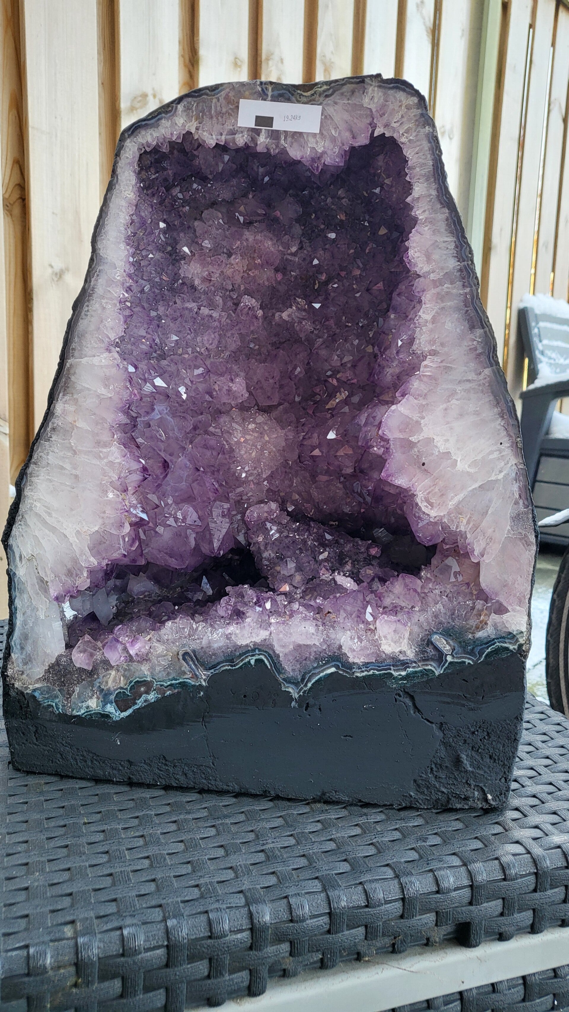 Indrukwekkende amethist geode afkomstig uit Brazilië. Dit prachtige exemplaar weegt 19,24 kg en heeft een hoogte van 37 cm en een breedte van 28 cm. De diepe paarse kleur en de kristalstructuur maken dit een uniek decoratiestuk. Gratis verzending! Vraag gerust om een filmpje voor een betere indruk.
