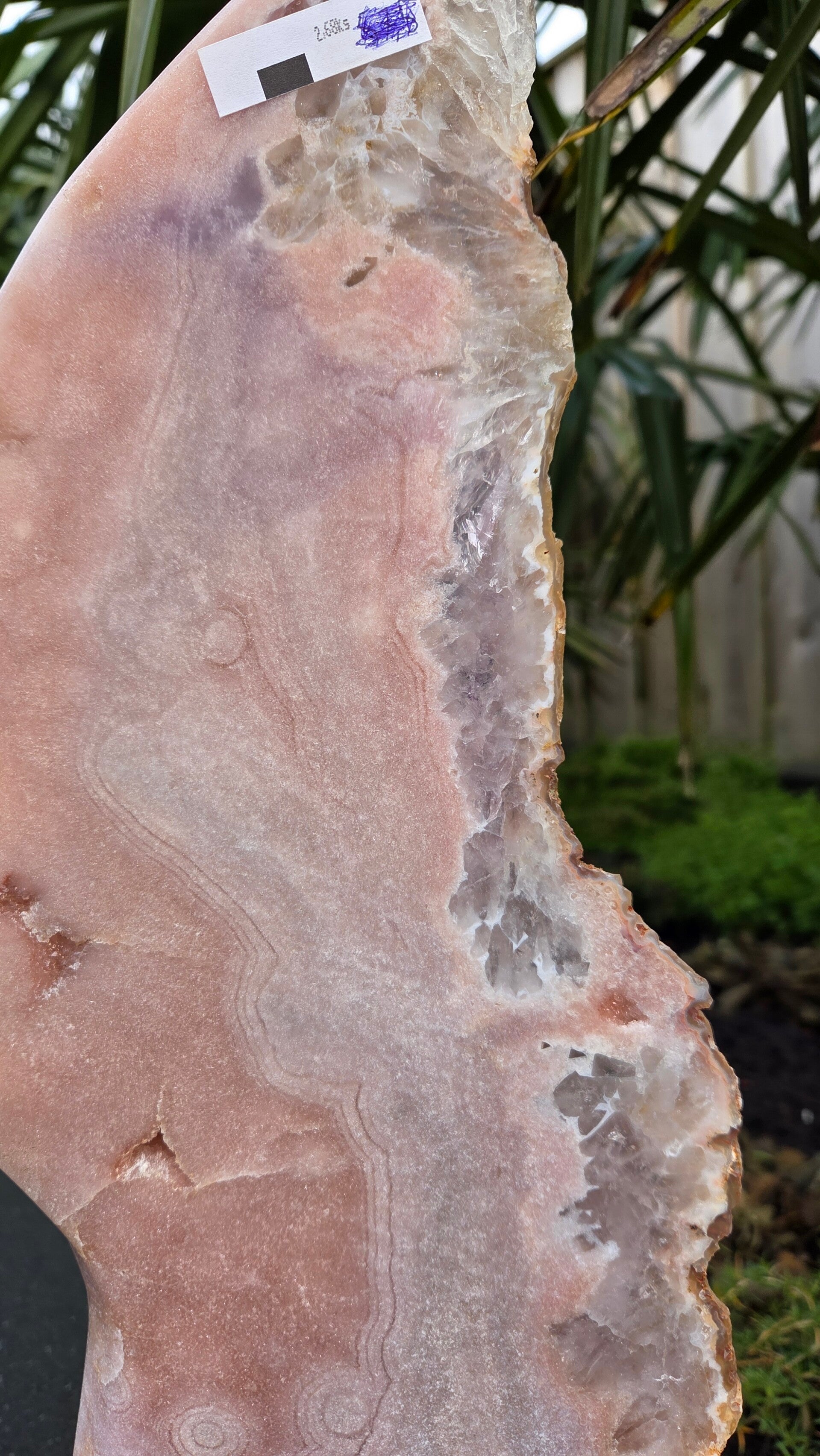 Een prachtige roze amethist slab, gepresenteerd op een elegante standaard. Deze unieke steen weegt 2,68 kg en heeft een hoogte van 47 cm inclusief de standaard. De breedte van de steen is 16 cm, terwijl de steen zelf 38,5 cm hoog is. Een echte blikvanger voor elke verzamelaar of liefhebber van natuurlijke schoonheid.
