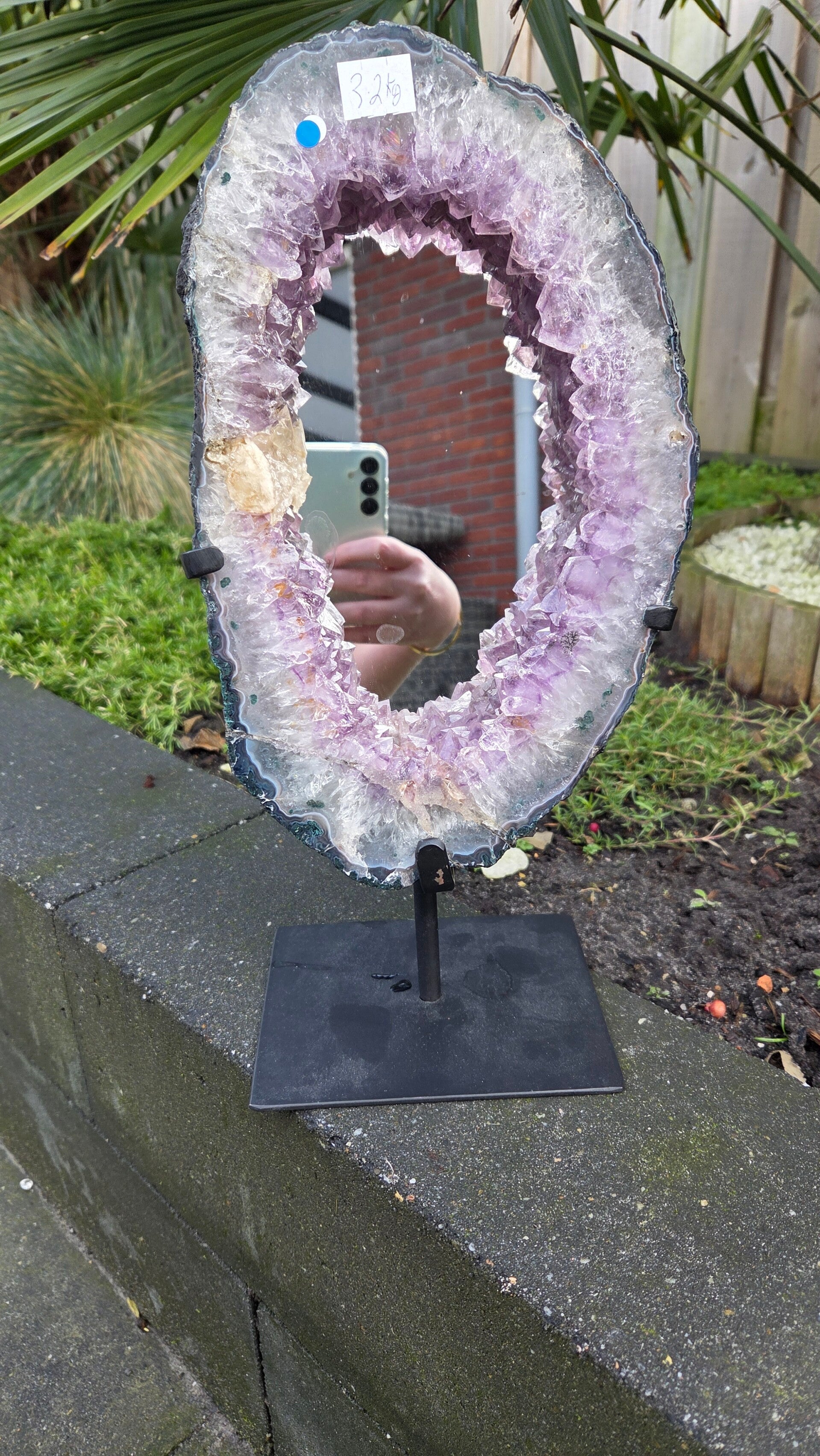 Prachtige en unieke amethist spiegel met calciet. Dit bijzondere stuk weegt 3,2 kg en is 36 cm hoog inclusief de standaard. De breedte is 18 cm, terwijl de steen zelf 29 cm hoog is. Een echte eyecatcher voor elk interieur!