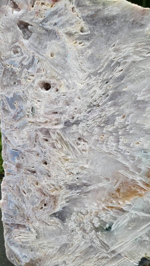 Prachtige en unieke roze amethist slab. Dit grote stuk weegt 3,57 kg en is inclusief de standaard 43 cm hoog en 22 cm breed. De steen zelf is 34 cm hoog. Een echte eyecatcher voor elke verzamelaar of liefhebber van mineralen. De roze/blauwe kleur is zeldzaam en maakt dit stuk extra bijzonder.