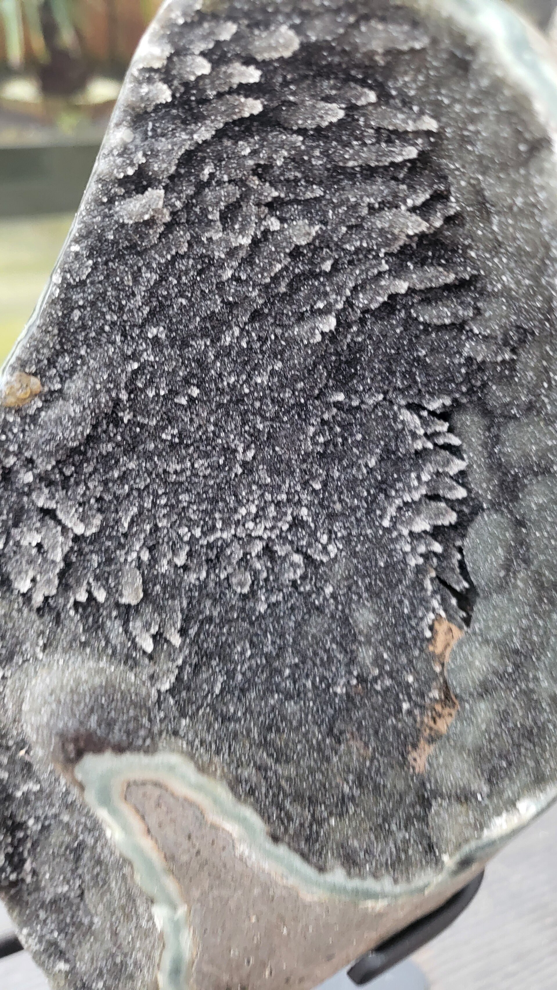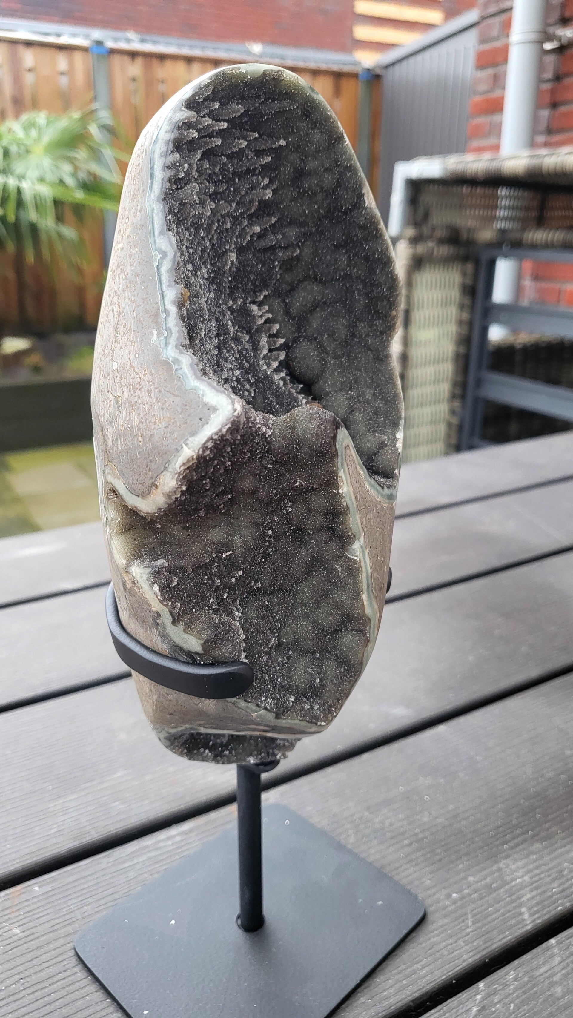 Een prachtige en unieke amethist, gepresenteerd op een elegante standaard. Dit object is een echte blikvanger voor elk interieur. De totale hoogte, inclusief de standaard, is 26 cm. De amethist zelf heeft een hoogte van 19 cm en een breedte van 10 cm. Een perfect decoratiestuk voor liefhebbers van mineralen en edelstenen.