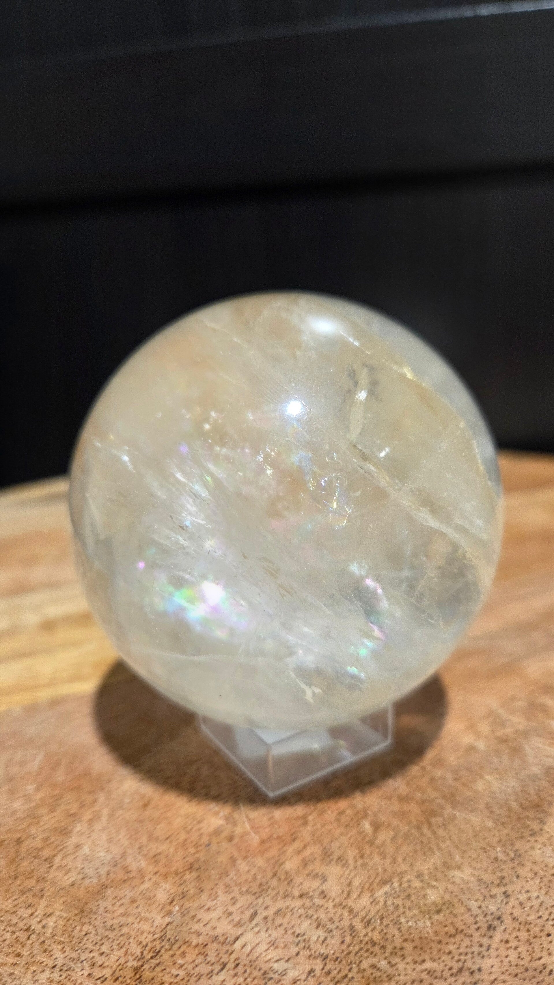 Prachtige XL bergkristal bol van circa 8 cm doorsnede. Deze bol weegt 660 gram en heeft een mooie kwaliteit met regenboog effecten. Een echte eyecatcher!