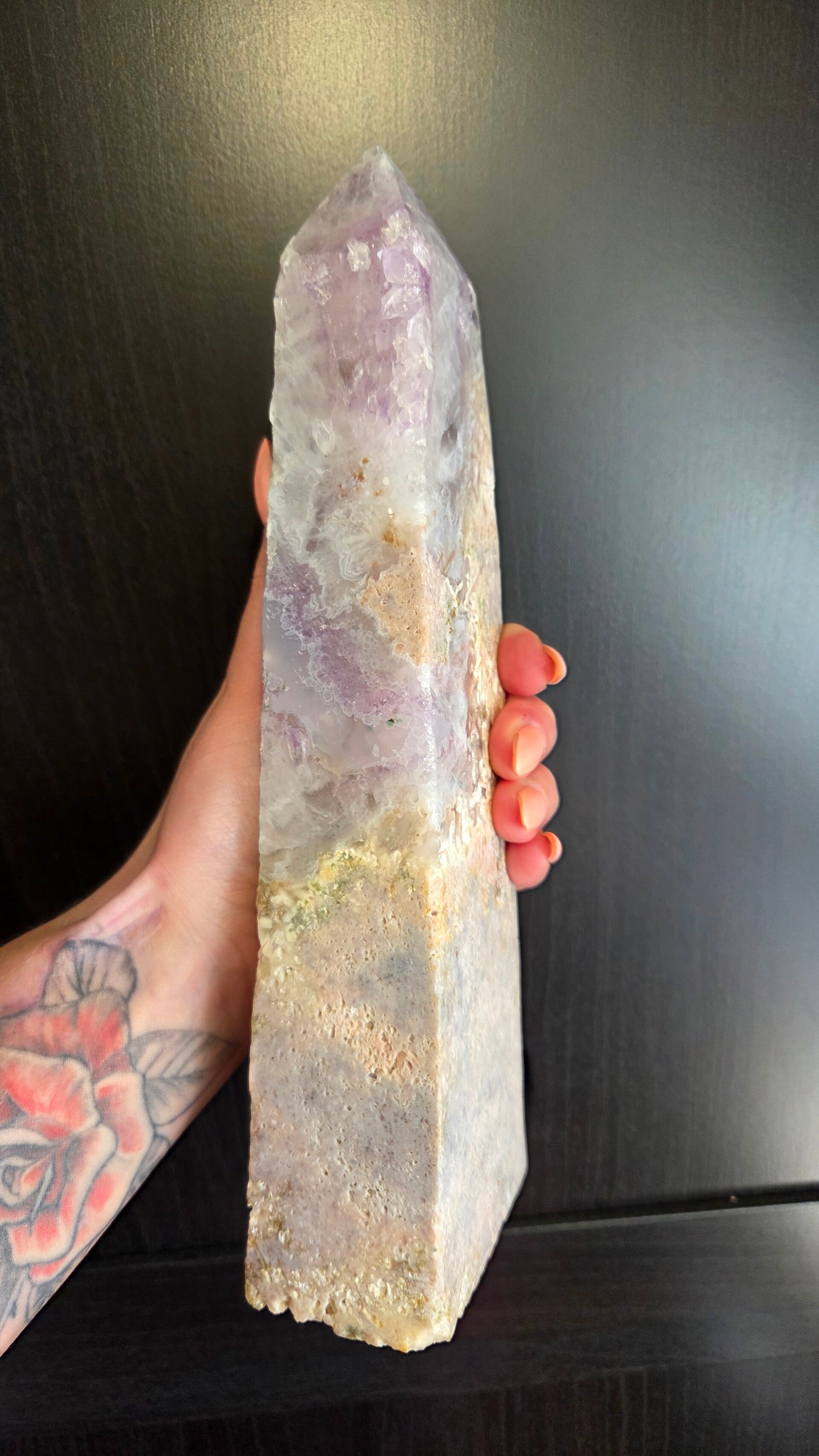 Deze XL roze amethist toren weegt 1,4 kg. De toren is 26 cm hoog en 8 cm breed aan de onderkant. De steen heeft mooie paarse en witte tinten.