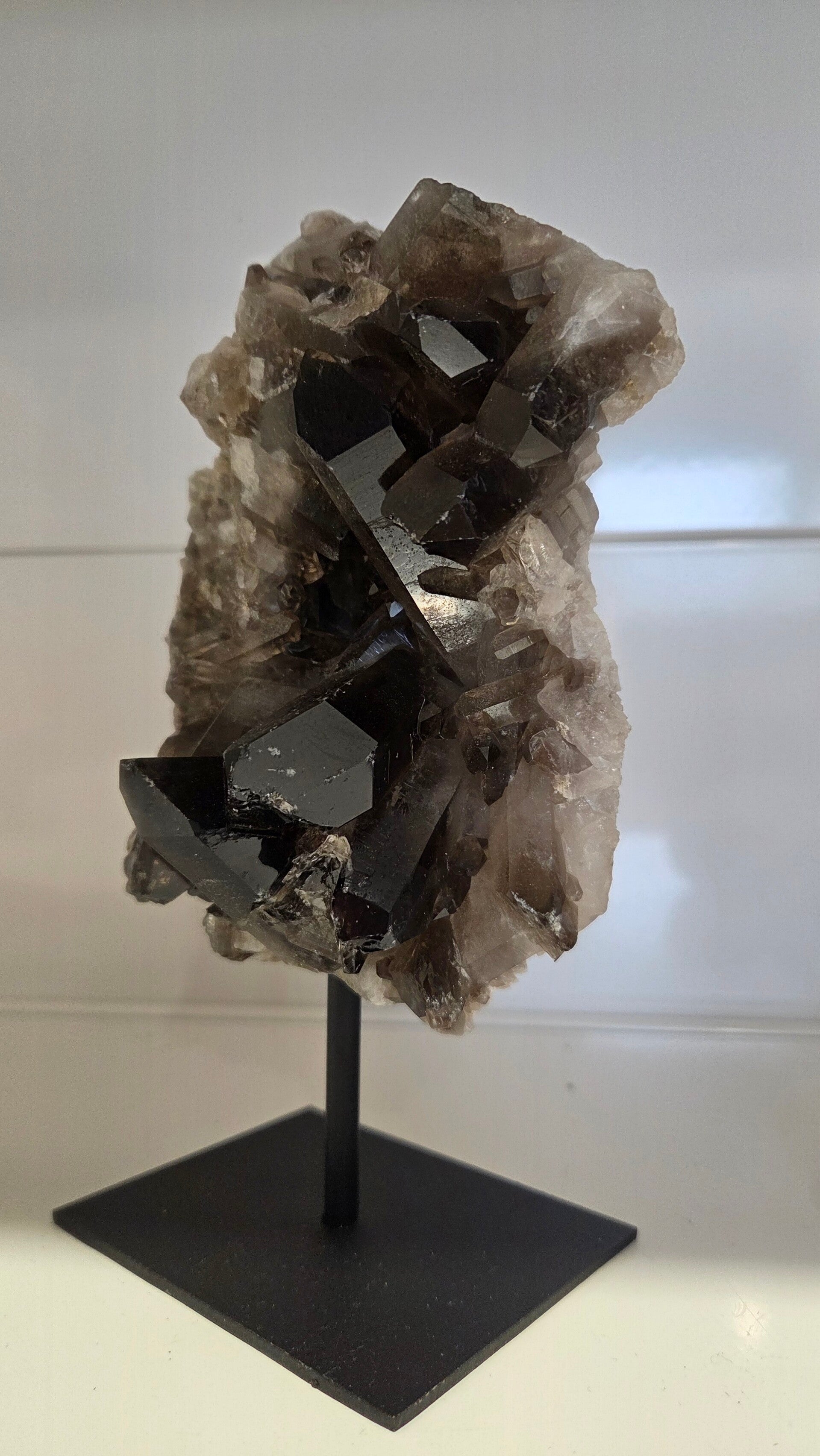 Mooie rookkwarts op een standaard. De steen weegt 1 kg en is 18,5 cm hoog en 10 cm breed. De rookkwarts heeft een donkere kleur met lichtere delen.