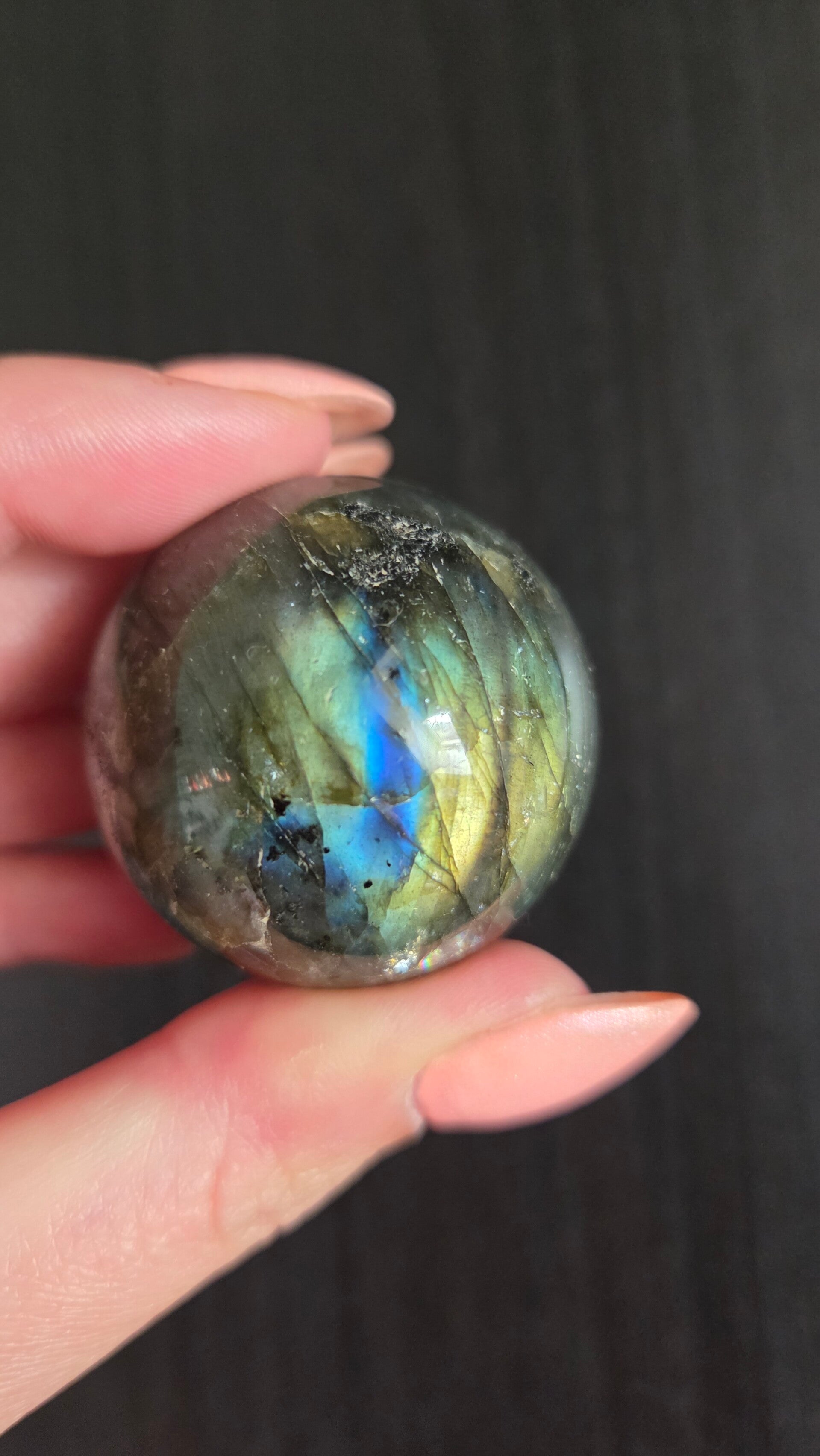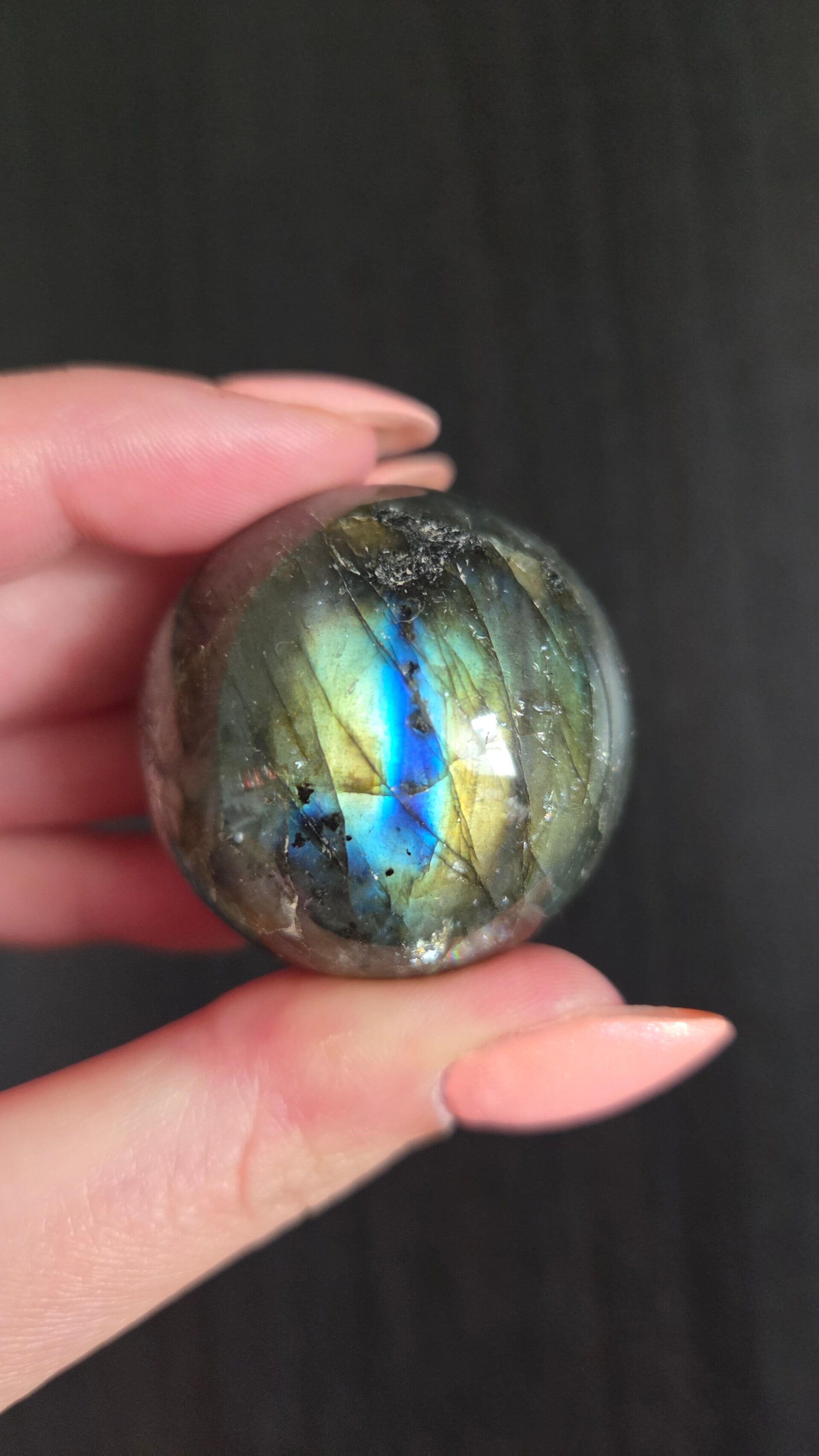 Een labradoriet bol van 95 gram en 4 cm groot. De steen heeft een mooie glans en kleur. Het is een natuurlijke steen.