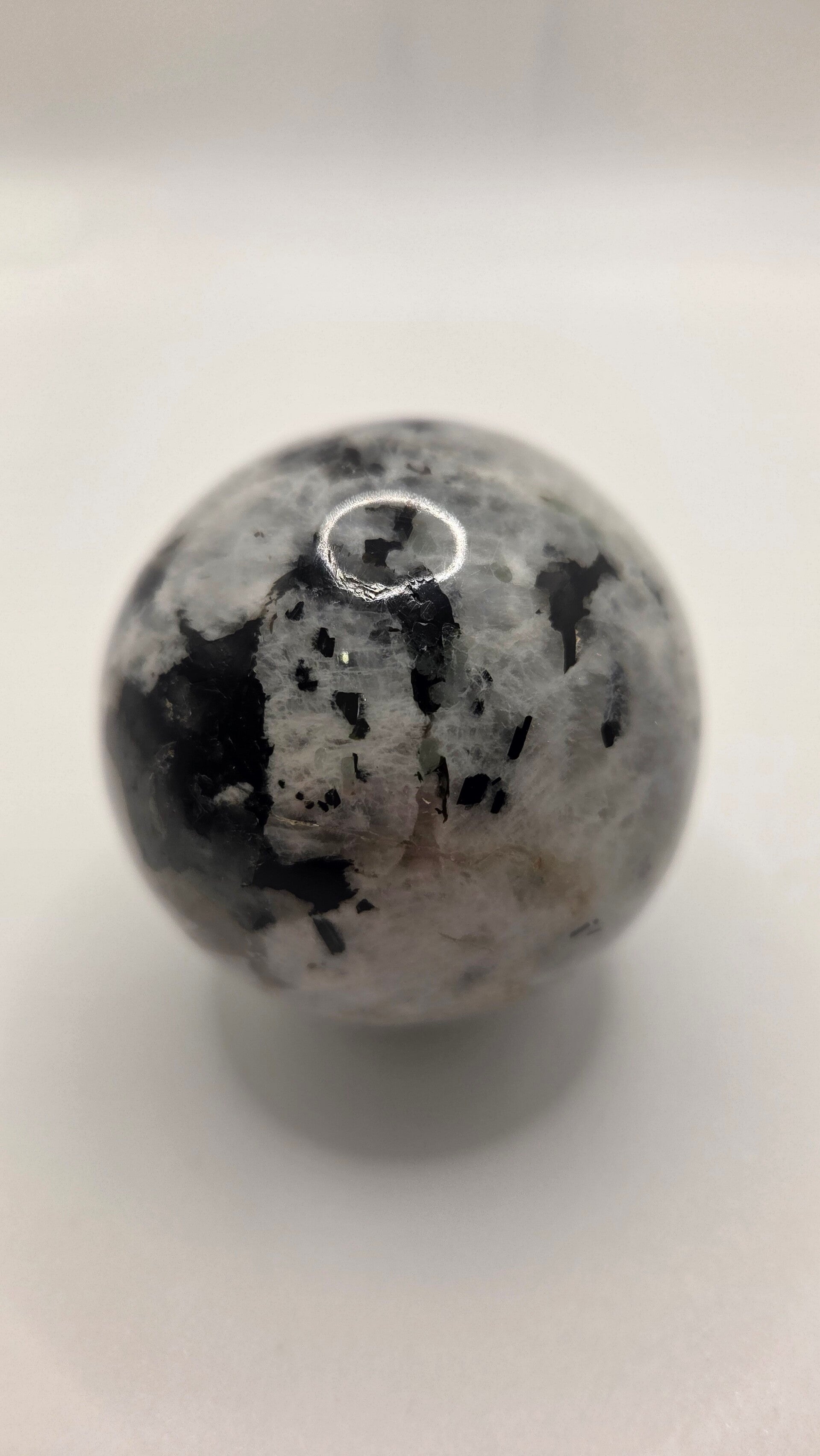 Mooie maansteen bol met een diameter van 5,5 cm. De bol weegt 215 gram. De steen heeft een mooie tekening met zwarte en witte tinten.