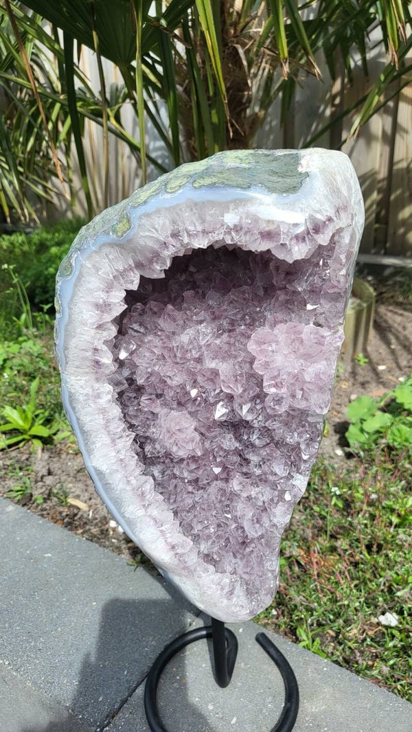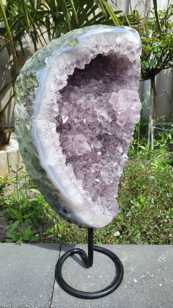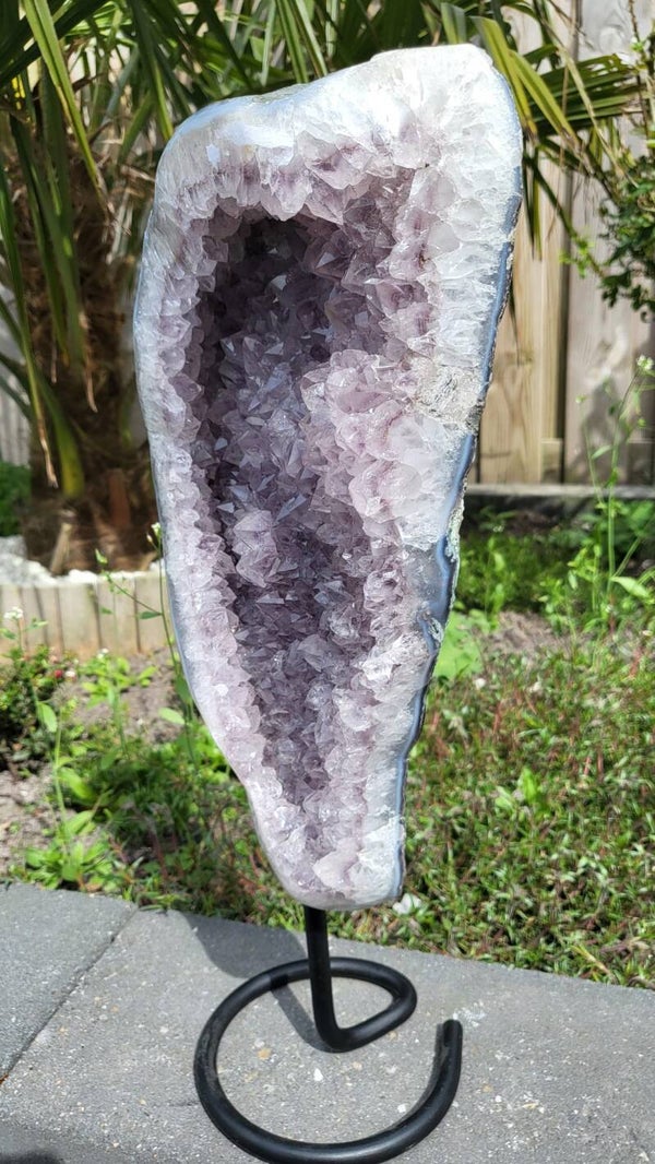 Grote amethist geode op een metalen standaard. De amethist weegt 4,7 kg en is 40 cm hoog en 17 cm breed. De kristallen zijn mooi paars van kleur.